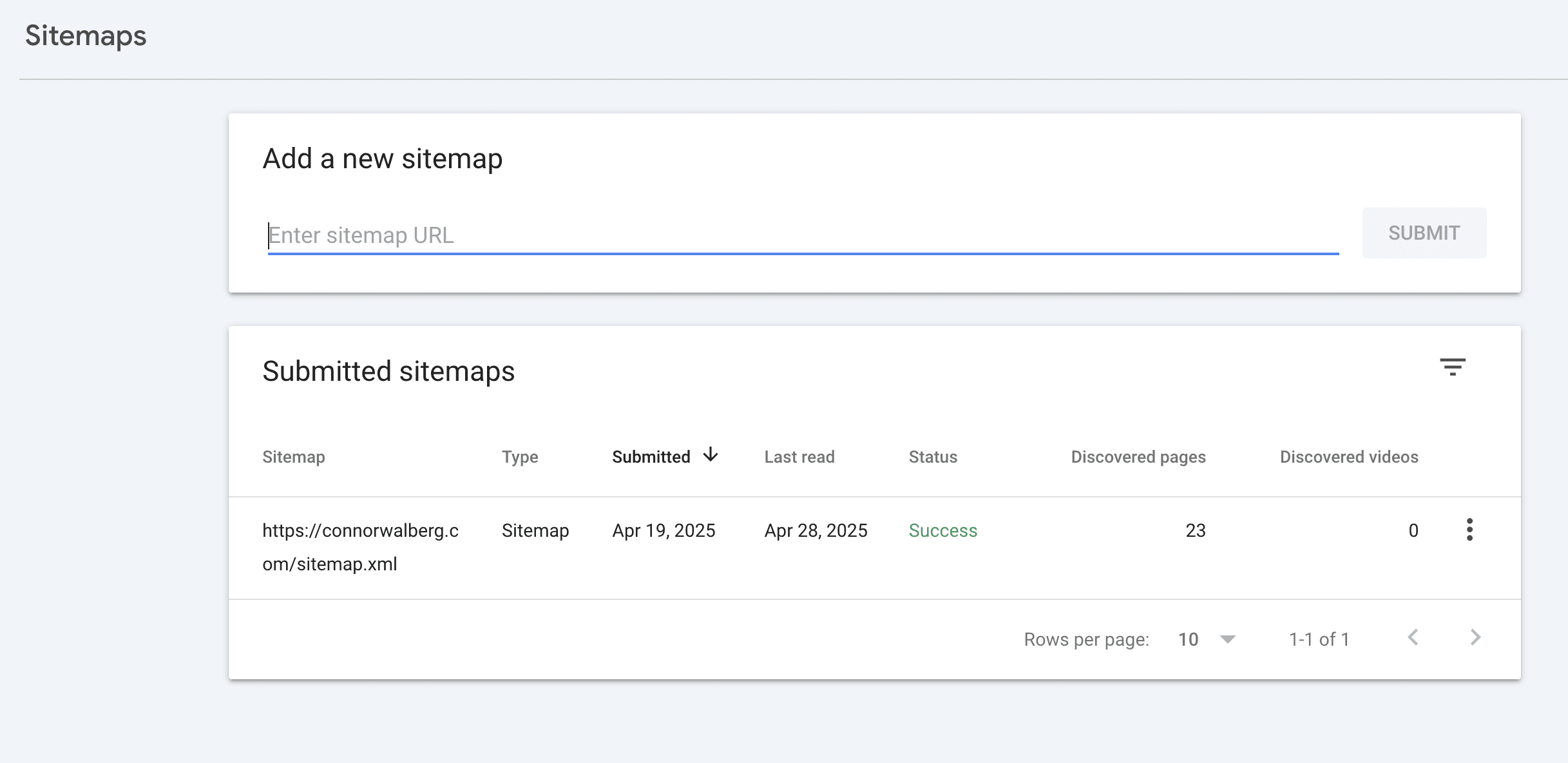 Here’s where you submit this in Google Search Console: Find the Sitemaps section in the left-hand menu. Paste the last part of your sitemap URL (everything after the domain), click “Submit,” and you’re done. This is a one-time step. After it’s added, Google will revisit it regularly to check for changes and hopefully update the search engine results. Easy peasy!
